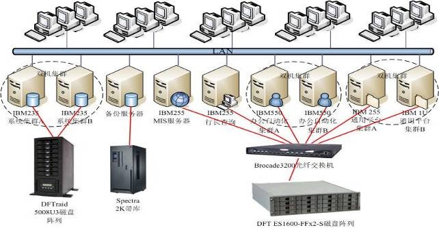 一臺IBM服務(wù)器安裝win2000操作系統,用作備份服務(wù)器,整個(gè)備份采用Veritas NetBaukup備份軟件,實(shí)現混合環(huán)境下的跨平臺統一備份和管理;支持系統采用兩臺IBM235服務(wù)器安裝sco unix操作系統,雙機熱備系統采用雙子星雙機軟件,sybase數據庫;MIS應用服務(wù)采用一臺IBM255服務(wù)器,安裝win2000操作系統;行業(yè)查詢(xún)服務(wù)器采用一臺IBM 255服務(wù)器,安裝win2000操作系統;OA辦公自動(dòng)化應用采用一臺IBM 230和一臺IBM550服務(wù)器安裝win2000操作系統,應用分別為DB2數據庫和Notes應用系統,通過(guò)DFT HA雙機軟件配置成高可用雙機熱備系統;通用平臺系統通過(guò)采用一臺IBM255和一臺IBM 1U機架式服務(wù)器安裝Sco unix操作系統和sybase數據庫,使用雙子星雙機軟件配成雙機熱備系統。