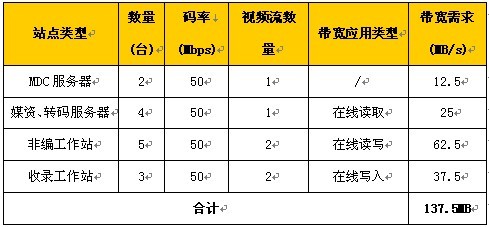 由上表,可以計算出整個(gè)系統需要的存儲帶寬,在設計存儲設備時(shí),要充分考慮計算出的帶寬,最好留有20%的冗余。為以后擴容上留有充足的余量,可有效的避免在系統的擴充以后造成投資浪費。