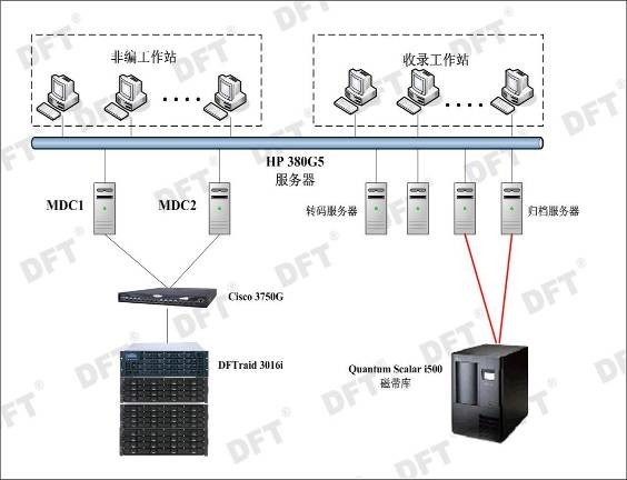 針對南方傳媒集團的項目需求和帶寬分析,結合DFT多年來(lái)的廣電行業(yè)存儲解決方案經(jīng)驗,建議用戶(hù)使用在線(xiàn)磁盤(pán)陣列采用高性?xún)r(jià)比的DFT RS-3016I一套(含3個(gè)SBOD擴展柜),并配置60塊500GB SATAII磁盤(pán),另配置思科3750G千兆以太網(wǎng)交換機構建獨立的IP-SAN網(wǎng)絡(luò ),昆騰i500帶庫直連歸檔服務(wù)器做媒資歸檔。項目拓撲圖如下: