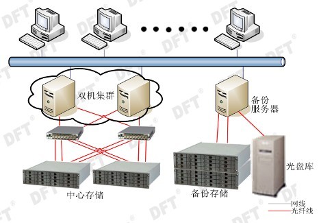 在方案的存儲方面,用兩臺DFT ES-1600-X24-D的磁盤(pán)陣列做中心存儲,采用了RAID5+SPARE的架構,總容量為7TB,且兩臺DFT ES-1600-X24-D磁盤(pán)陣列都采用Active/Active的工作模式,在這種工作模式下,其中任何一個(gè)控制器出現了故障另一個(gè)控制器會(huì )自動(dòng)接管故障控制器的RAID,訪(fǎng)問(wèn)速度由原來(lái)的1Gb/s提升到4Gb/s,以保證PACS系統的讀寫(xiě)速度。再用一臺DFT ES-1600-SATA-D加一臺擴展柜做PACS系統的備份,同樣采用了RAID5+SPARE的架構,總容量為14TB,并且當中心存儲出現了嚴重故障或維護時(shí),用戶(hù)可以通過(guò)手動(dòng)更改IP的方式,讓備份服務(wù)器代替中心存儲以保證PACS系統的不中斷工作。