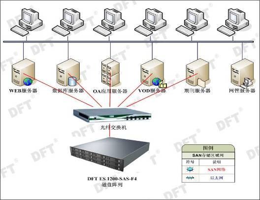 在方案設計中,我們充分考慮用戶(hù)的需求,在容量需求很大和高性能的磁盤(pán)陣列需求方面,給用戶(hù)設計了DFT ES-1200-SAS-F4產(chǎn)品。該產(chǎn)品磁盤(pán)通道采用新一代的SAS技術(shù),即Series Attach SCSI、串行SCSI,SAS磁盤(pán)端達到3Gb交換式結構。此技術(shù)改善了存儲系統的效能、可用性和擴充性,將取代SCSI并成為下一代企業(yè)級存儲接口主流技術(shù);該產(chǎn)品為用戶(hù)提供了16Gb(4x4Gb)帶寬,在很大的程度上提高了整個(gè)系統的訪(fǎng)問(wèn)速度。