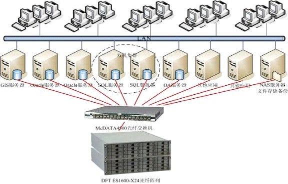 方案主要完成信息中心SAN網(wǎng)存儲系統及NAS文件共享存儲系統 ,同時(shí)完成數據庫服務(wù)器高可用集群系統。為了解決用戶(hù)以前數據分散,不易管理的問(wèn)題,滿(mǎn)足用戶(hù)集中管理,集中存儲的需求,信息中心所有的SQL,ORACLE,OA等應用服務(wù)器的數據存儲將采用SAN存儲架構,磁盤(pán)陣列采用DFT ES1600-X24全光纖磁盤(pán)陣列,DFT ES1600-X24擁有四個(gè)連接主機的光纖通道環(huán)路和超常的讀寫(xiě)性能,具有670 MB/sec連續傳輸速度,支持高達72TB容量,是適合于諸如視頻、醫學(xué)圖像、數據庫和高性能計算的理想高帶寬的存儲解決方案。為減少以前數據備份的工作量,數據備份采用Veritas自動(dòng)備份軟件,將數據備往至NAS備份系統之上,在今后的二期工程中考慮采用高容量的帶庫系統進(jìn)行備份。對于關(guān)鍵性業(yè)務(wù)系統,要求7*24小時(shí)不間斷運行,方案采用DFT 雙機集群系統,DFT HA在兩臺服務(wù)器上執行,提供相互備援保護檢測程序(HA Daemon)。如果任何一臺服務(wù)器上的服務(wù)被不正常中止,DFT HA將自動(dòng)啟動(dòng)連接被中止服務(wù),此過(guò)程不需要人為操作介入,這種防錯功能可確保重要的應用程序服務(wù)不被中斷。