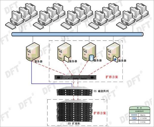 根據國家林業(yè)局調查規劃設計院具體的需求,再經(jīng)DFT仔細分析,方案采用最新的DFT ES1200-SAS-F4磁盤(pán)陣列(設計容量為2.1TB)來(lái)滿(mǎn)足用戶(hù)需求。FC光纖架構在目前企業(yè)級存儲解決方案中最為成熟,通過(guò)高效的FC協(xié)議和最新的4GB 光纖技術(shù)能夠滿(mǎn)足用戶(hù)讀寫(xiě)大容量數據的速度需求。另外,以后隨著(zhù)數據增加以及服務(wù)器增加能夠輕松的升級到FC-SAN架構,保證了用戶(hù)有效的投資。