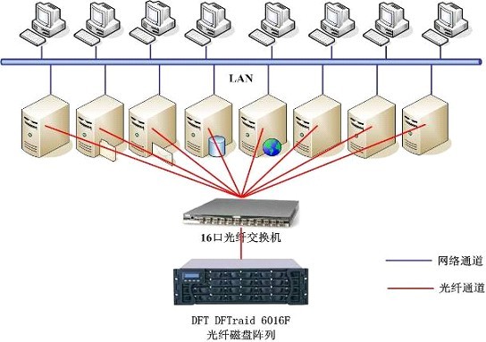 綜合上面種種弊端,新疆民航局航務(wù)信息部使用了DFT提供的高可用性數據集中存儲解決方案。在該方案中,將每一臺服務(wù)器中的關(guān)鍵數據均放置在DFTraid 6016全光纖存儲設備中,同時(shí)還在關(guān)鍵數據庫服務(wù)器中使用雙機冗余配置,提供7×24小時(shí)不間斷高可用性數據庫服務(wù)。