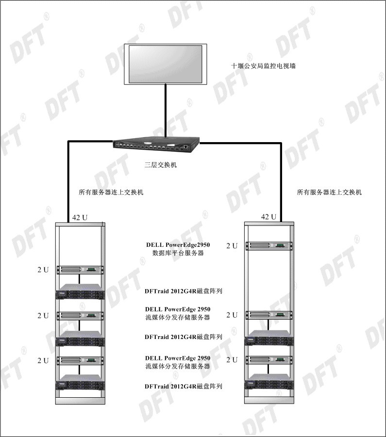 目前服務(wù)器主要是采用5臺DELL PowerEdge2950流媒體服務(wù)器,操作系統采用WINDOWS 2003 SERVER,應用的流媒體服務(wù)軟件為湖北維用提供的監控管理軟件。此服務(wù)器將是整個(gè)流媒體存儲的關(guān)鍵服務(wù)器,數據的安全,快速存儲將直接影響到整個(gè)服務(wù)運行的穩定性。由于該項目是有中國電信湖北公司全額出資以租賃的方式給湖北省十堰市公安局使用,所以成本的控制以及性?xún)r(jià)比是用戶(hù)中國電信方案設計的重點(diǎn)。該方案一期采用的是5臺DFTraid 2012G4R磁盤(pán)陣列以DAS直連的方式分別接在5臺流媒體服務(wù)器上。