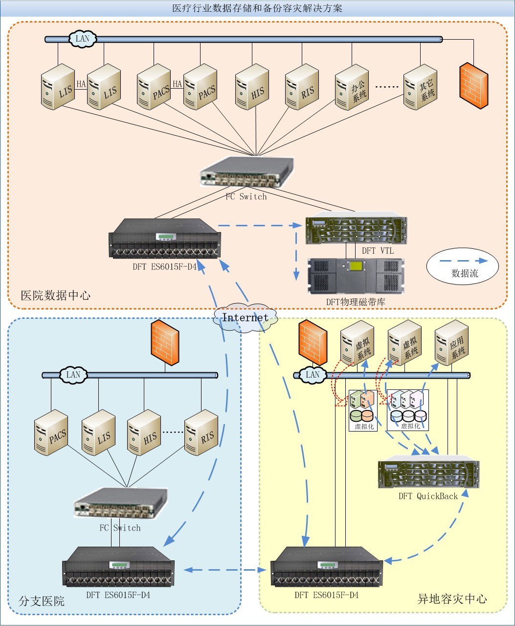 由于醫療行業(yè)數據的特殊性,要求存儲系統的連續性以及數據保存的長(cháng)期性,為了全面保證醫院數據中心的安全,按照數據存儲備份和容災的不同需求和級別,我們建議采用多級的系統安全方案。根據對數據中心的應用分析,我們把整個(gè)應用系統劃分多個(gè)級別――數據中心存儲系統、數據備份系統、數據存檔系統、數據容災系統。通過(guò)多個(gè)安全級別的防護措施,充分保障服務(wù)器連續運行能力、數據的安全備份與容災、發(fā)生故障時(shí)的及時(shí)恢復效率。DFT為醫療行業(yè)的數據平滑遷移、安全擴容、容災備份提供一套完整的解決方案,整個(gè)存儲應用系統可根據醫院發(fā)展規劃分步實(shí)現。在此方案中,建議采用DFT ES6015F-D4作為數據中心存儲系統,結合DFT VTL和DFT物理磁帶庫實(shí)現數據備份和醫療病歷信息存儲歸檔,并且可根據需要隨時(shí)建立數據容災中心。