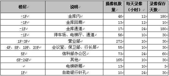 整個(gè)系統分為兩大部分:對金庫區的監控、對整個(gè)大廈的監控,這兩部分物理隔離,分別有自己的存儲系統和監控中心。各區域監控點(diǎn)需求如下: 所有監控圖像存儲在5層核心機房,金庫區監控圖像獨立存儲。