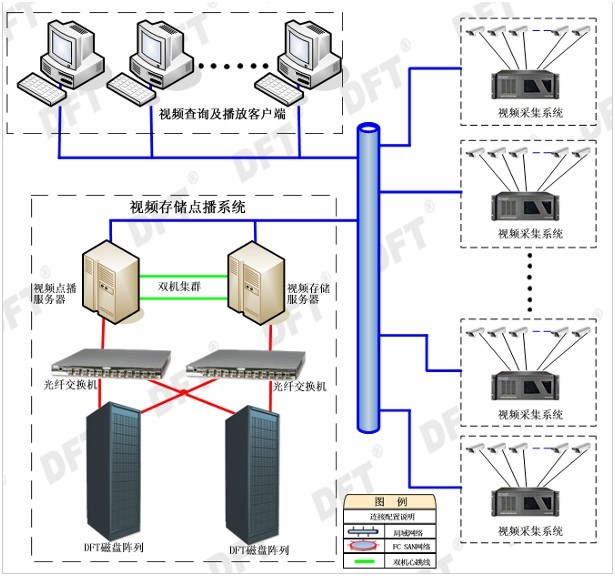 數字法庭是指法官、原告、被告、公訴人、犯罪嫌疑人、證人在庭審過(guò)程中產(chǎn)生的文字信息、視頻信息、音頻信息和各類(lèi)舉證信息都將實(shí)現數字化采集、存儲、傳輸與顯示。DFT公司針對于數字法庭過(guò)程中產(chǎn)生的數據源種類(lèi)較多,碼流大,且庭審過(guò)程中需要對采集數據進(jìn)行采集和回放的特點(diǎn),設計采用了光纖架構的存儲設備,為保證庭審監控數據的可靠性,采用兩套光纖存儲設備鏡像的模式,確保巨量壓力下視頻數據的完整性。